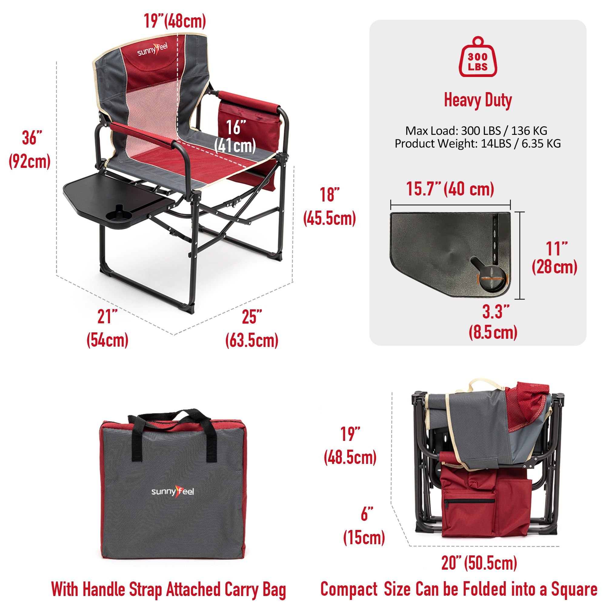 Convenient Storage: The flip-up side table and the integrated beverage & phone holders free your hands, and the double front multi-pocket attached on side providing ample storage to store your books, magazines, iPad, keys, wallets, keeping your belongings organized.Built to Last: The sturdy steel frame construction affords up to 300 LBS (136KG) weight capacity and the chair weights 13.4 LBS (6.1KG). The double-seam 600x300D Oxford Cloth & 200g mesh has great strength, durability, and breathability. You don't have to worry for the heavy-duty use, either to buy a new one in the near future.