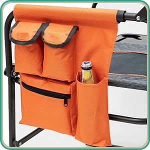 Convenient Storage: The flip-up side table and the integrated beverage & phone holders free your hands, and the double front multi-pocket attached on side providing ample storage to store your books, magazines, iPad, keys, wallets, keeping your belongings organized.Built to Last: The sturdy steel frame construction affords up to 300 LBS (136KG) weight capacity and the chair weights 13.4 LBS (6.1KG). The double-seam 600x300D Oxford Cloth & 200g mesh has great strength, durability, and breathability. You don't have to worry for the heavy-duty use, either to buy a new one in the near future.